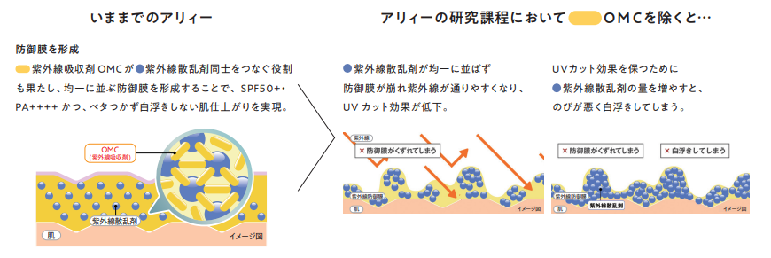 そこで、2022年2月からはアリィーの日焼け止めでは、「紫外線吸収剤」をなくし、UV紫外線を反射して日焼けを防ぐ「紫外線散乱剤」をにはバランスよく配合。