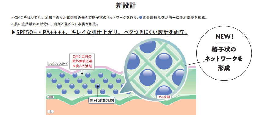 肌への負担が少ない分、伸びが悪く白浮きしやすかった「紫外線散乱剤」が、膜を張るように均一に並べる技術でより使いやすくなりました♪